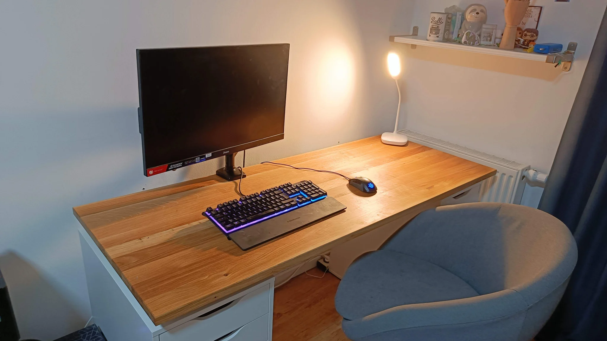 Stelle sicher, dass alle Kabel ordentlich verlegt werden. Kabelkanäle oder Clips können hier helfen, den minimalistischen Look zu bewahren. Eine dezente Tischlampe, wie auf dem Bild gezeigt, ergänzt das Setup und sorgt für die richtige Beleuchtung.